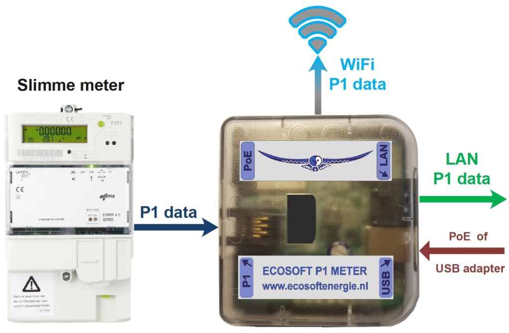 De Ecosoft P1-meter wordt aangesloten op de de P1-poort van de slimme meter in de meterkast. De slimme meter stuurt dan huidig energieverbruik en meterstanden aan de P1-meter door. Bekijk de gegevens in de webinterface van de P1-meter. Stuur deze gegevens (optioneel) naar de Ecosoft server door, waar ze kunnen worden bewaard en in grafieken worden weergegeven.