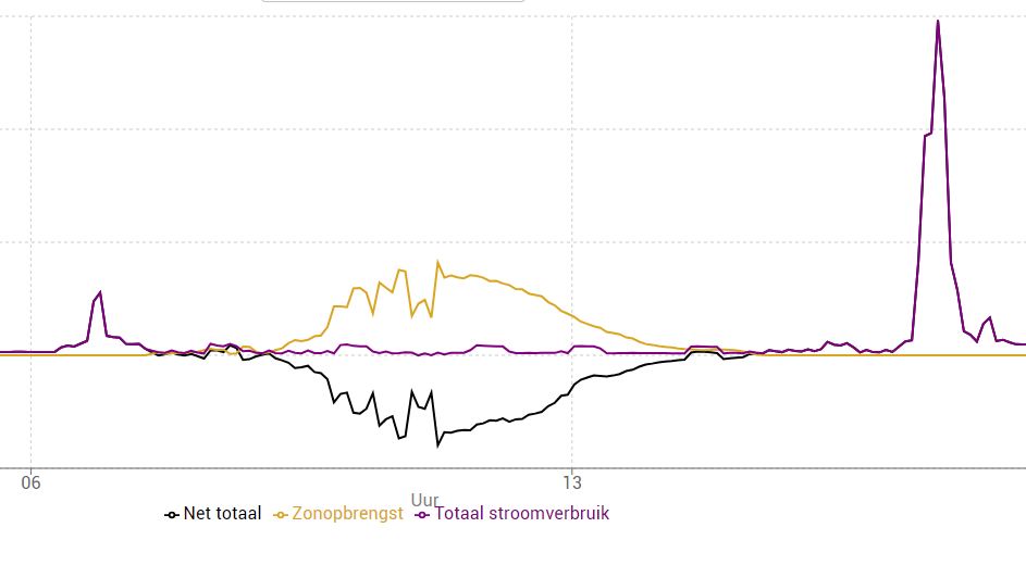 De zonopbrengst (gele lijn) wordt afgetrokken van het net totaal (zwarte lijn). De uitkomst is het totaal stroomverbruik (paarse lijn). In dit voorbeeld heeft de paarse lijn in de middag een paar kleine pieken die laten zien dat er een apparaat stroom verbruikt.