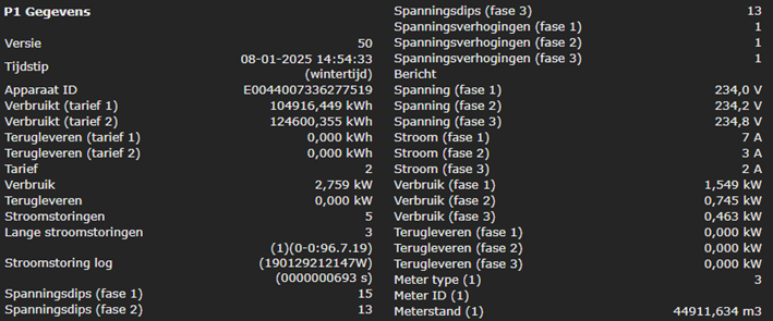 Om meer gegevens te zien, klikt u op de knop P1 Gegevens. De gegevens die dan getoond worden bevatten o.a. de actuele spanning (V) en stroom (A) per fase, het aantal stroomstoringen en spanningsdips. Dit scherm wordt niet automatisch ververst. Ververs handmatig de pagina (F5) in uw browser om nieuwe gegevens op te halen.
