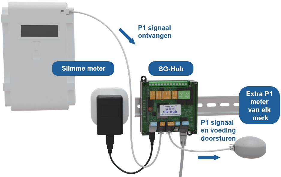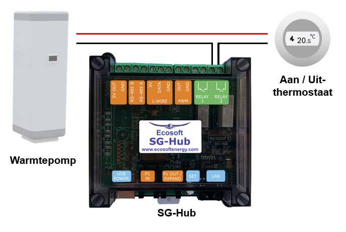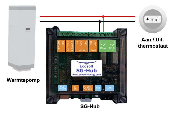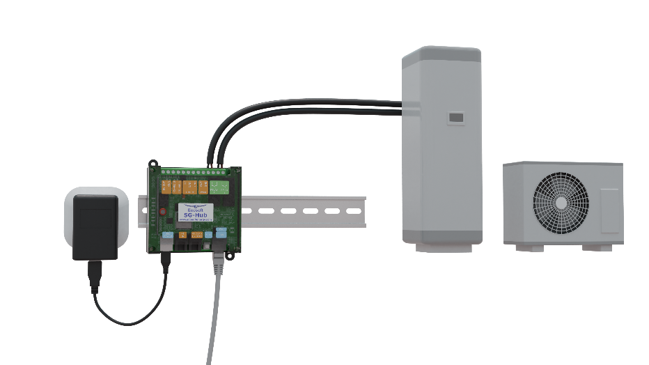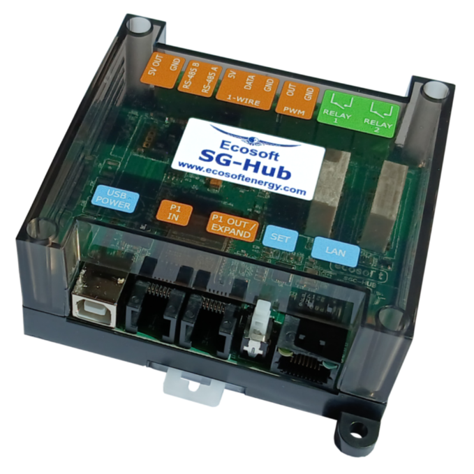 De Ecosoft SG-Hub is een slimme schakelaar met twee relais, WiFi, ethernet en andere aansluitingen, om verbonden apparaten te schakelen om energiekosten te besparen. De SG-Hub is onder andere geschikt voor warmtepompen, hybride warmtepompen, warmtepompboilers en PV-systemen.